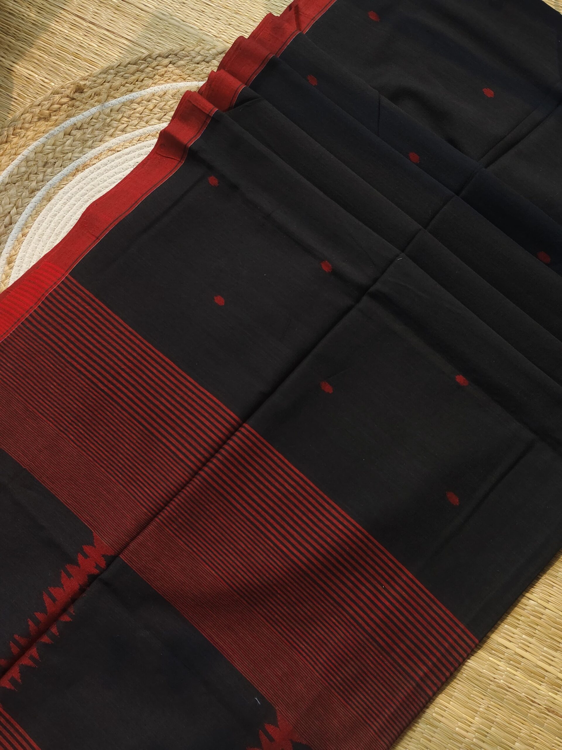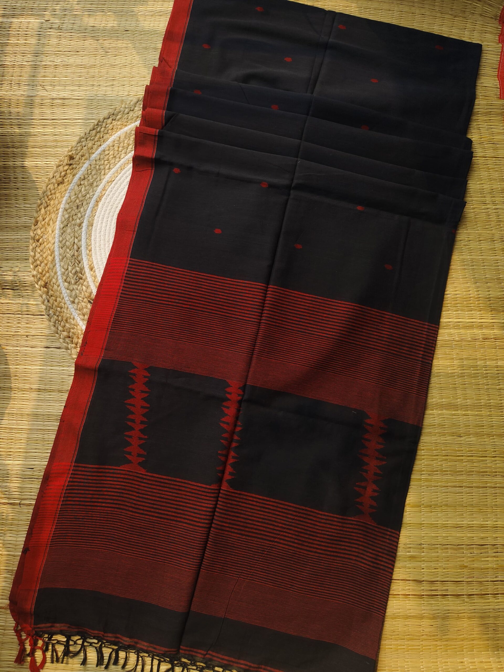 Charulata Jamdani reflects quiet elegance. This classic black Jamdani is handwoven cotton by cotton, showcasing the beauty of traditional craftsmanship. Soft, breathable, and perfect for both day and evening wear. Comes with a matching blouse piece for a complete refined look.