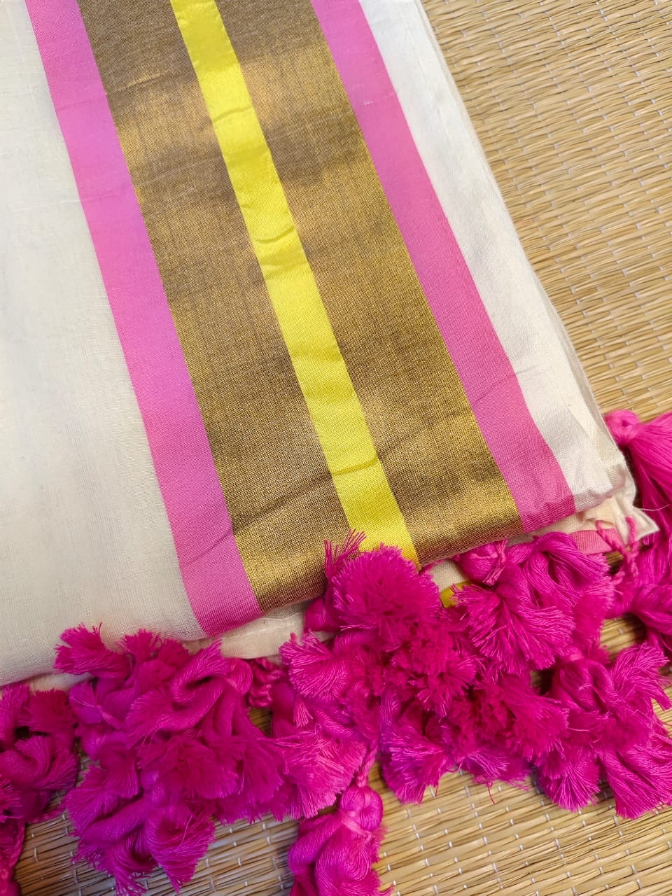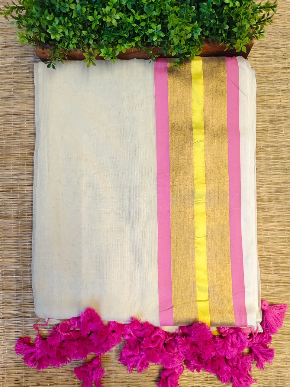 Swarnapankhi is woven in pristine white Kasavu saree, edged with a shimmering golden border and a playful touch of pink. The harmony of purity and festivity makes this saree a perfect choice for celebrations, pujas, and graceful evenings. Lightweight yet regal, it carries the essence of timeless Indian tradition in every fold.